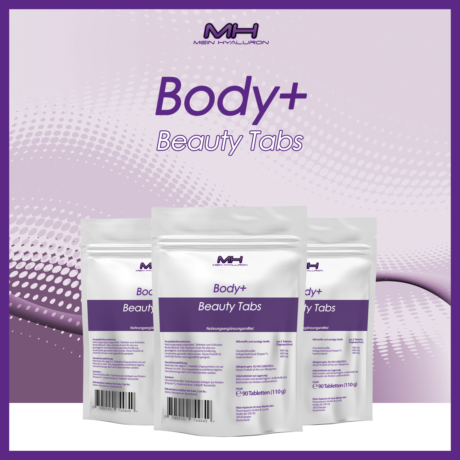 Mein Hyaluron Beauty+Body Tabs - wiederverschließbarer, lichtundurchlässiger Standbeutel á 90 Tabletten. Mein Hyaluron Beauty+Body Tabs sind Ihre Quelle für 3 wertvolle Nährstoffe in der einfachen und bequemen Tablettenform. Neben Chondroitinsulfat und Hyaluronsäure findet sich in Mein Hyaluron Beauty+Body Tabs noch hydrolysiertes Kollagen (Typ-1-Kollagenpeptid PEPTAN®).