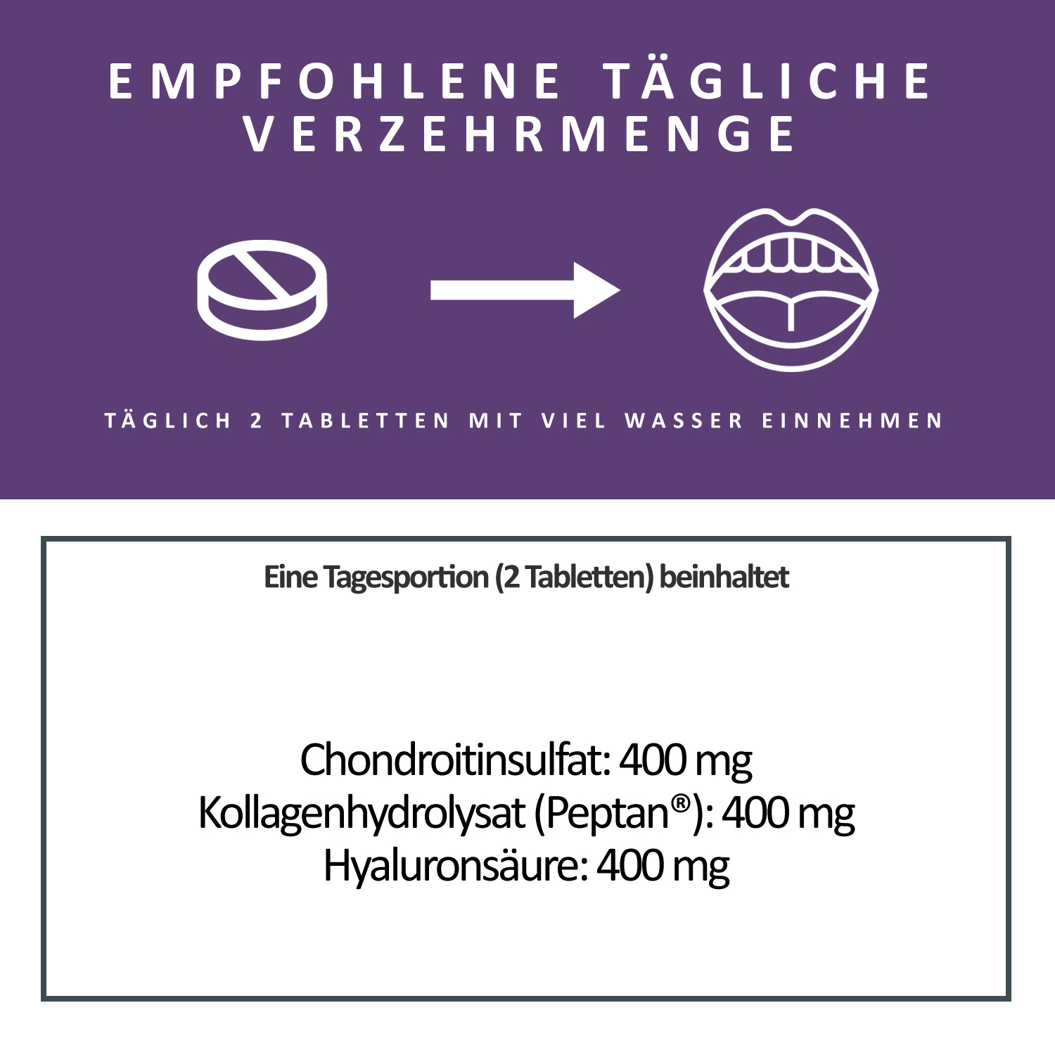 Mein Hyaluron Beauty+Body Tabs sind Ihre Quelle für Chondroitinsulfat, Kollagenhydrolysat (Peptan®) und Hyaluronsäure in einfacher und bequemer Tablettenform. Pro Tagesportion findet sich eine Menge zu je 400 mg (Milligramm) Kollagen Typ-1-Kollagenpeptid (PEPTAN®), Chondroitinsulfat und Hyaluronsäure.