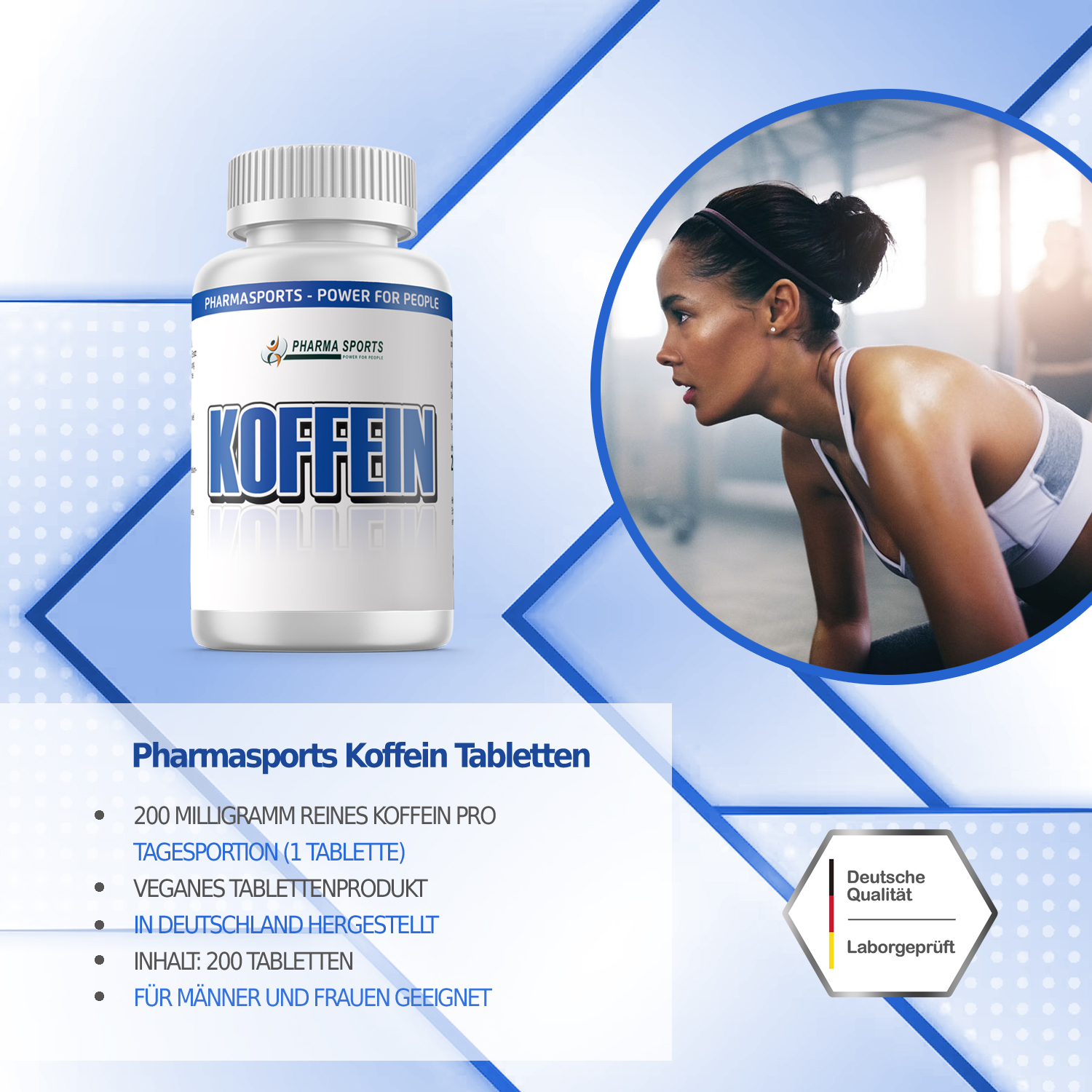 Pharmasports Koffein - Standdose á 200 Tabletten. Pharmasports Koffein ist Ihre Quelle für Koffein in der einfachen und bequemen Tablettenform. Pro Tablette finden sich in Pharmasports Koffein 200 Milligramm reines Koffein. Durch die bequeme Tablettenvariante wird nicht nur die Einnahme vereinfacht, sondern zudem auch eine genaue Tagesdosierung ermöglicht. Geliefert wird Pharmasports Koffein in einer wiederverschließbaren Standdose mit einem Inhalt von 200 Tabletten, welche zugleich auch 200 Tagesportionen á 1 Tablette darstellen.