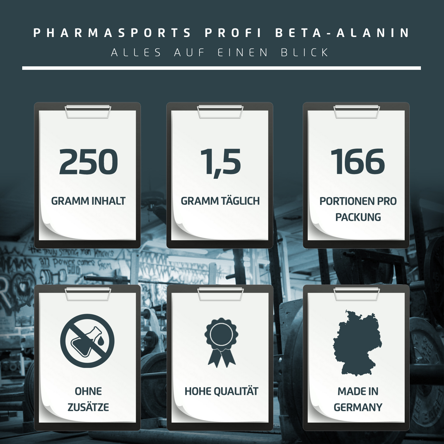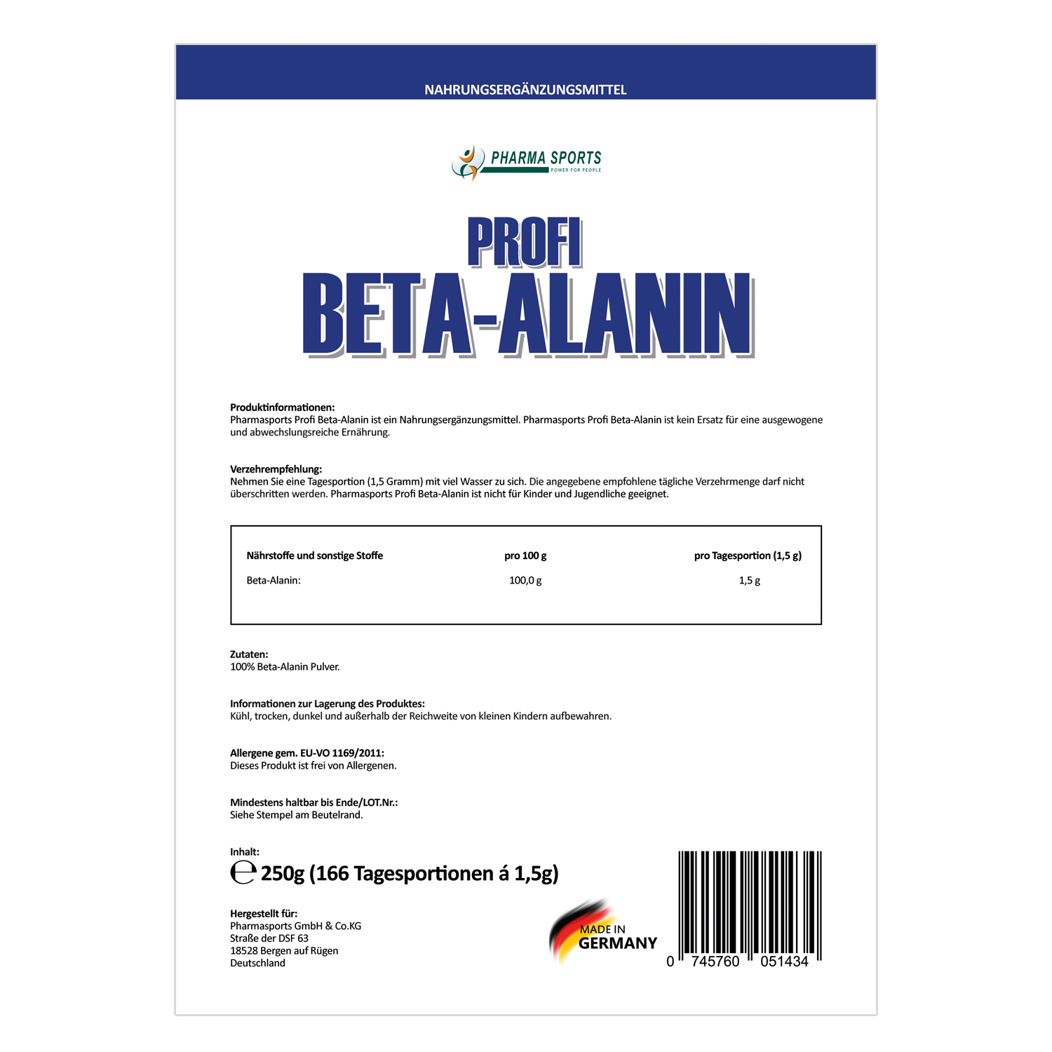 Pharmasports Profi Beta Alanin - Standbeutel á 250 Gramm. Pharmasports bietet Ihnen mit Pharmasports Profi Beta Alanin reines Beta Alanin Pulver, ganz ohne Zusätze wie Farb- oder Geschmacksstoffe. Pro Standbeutel sind 250 Gramm enthalten, welche rund 166 Einzelportionen á 1,5 Gramm entsprechen.