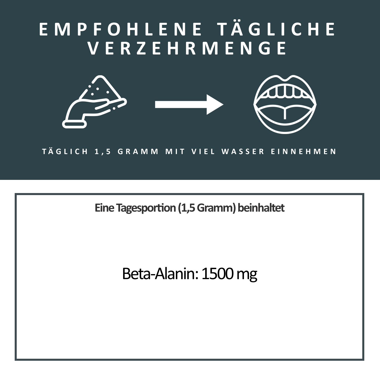 Pharmasports Profi Beta Alanin kommt 2 mal täglich zum Einsatz mit zwei Einzelportionen von je 1,5 Gramm. An Trainingstagen nutzen Sie eine Einzelportion von 1,5 Gramm am Morgen und ca. 20 Minuten vor dem Training. An trainingsfreien Tagen kommt eine Einzelportion von 1,5 Gramm am Morgen und eine weitere Einzelportion (ebenfalls 1,5 Gramm) am Abend zum Einsatz. Die Einzelportion kann in Flüssigkeit wie Wasser oder Fruchtsaft gegeben werden oder pur verzehrt werden. Beta-Alanin sollte täglich zu sich genommen werden. Unabhängig davon, ob Sie an dem Tag trainieren oder nicht.